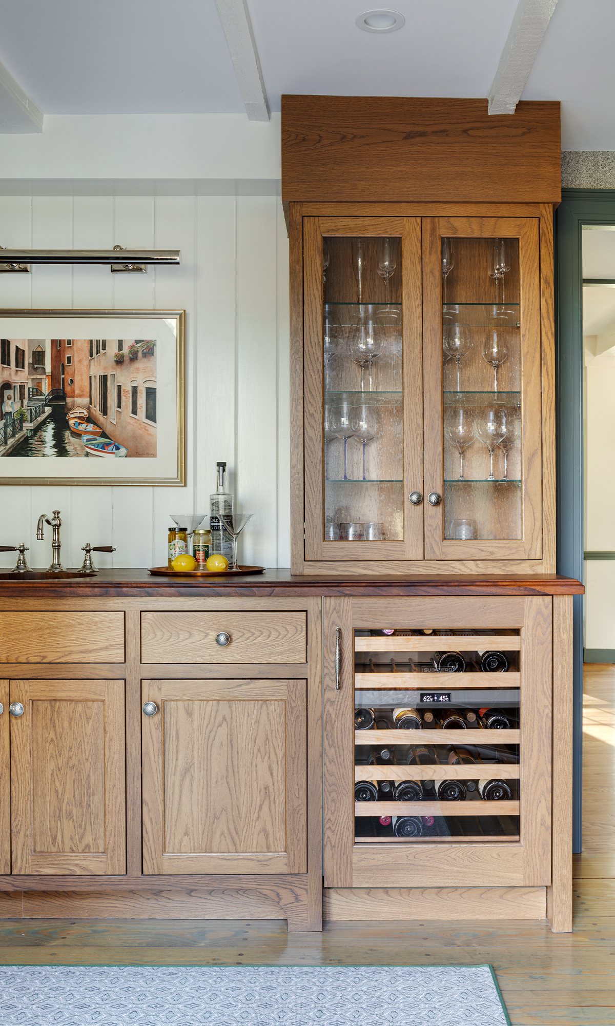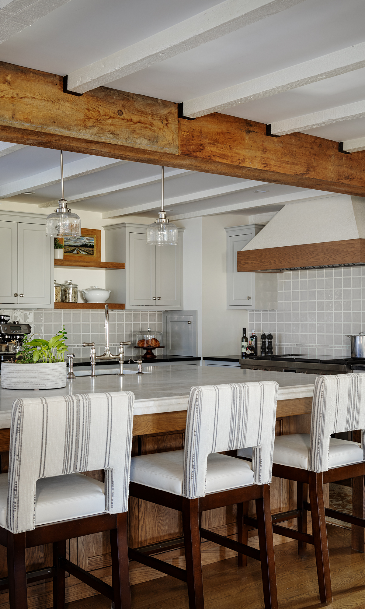 While the home was spacious enough, previous renovations were not kind to the historic fabric of the home.They wanted to design a space that evoked a feel of the original home and wanted to incorporate exposed beams throughout the kitchen and living spaces, while making the renovation feel modernized and elevated, without feeling stuffy. They pictured the kitchen as the heart of the home, acting as the driving force behind an open floor plan. Additional renovations were done to the mudroom, Primary Suite, and adult and teen entertainment spaces.